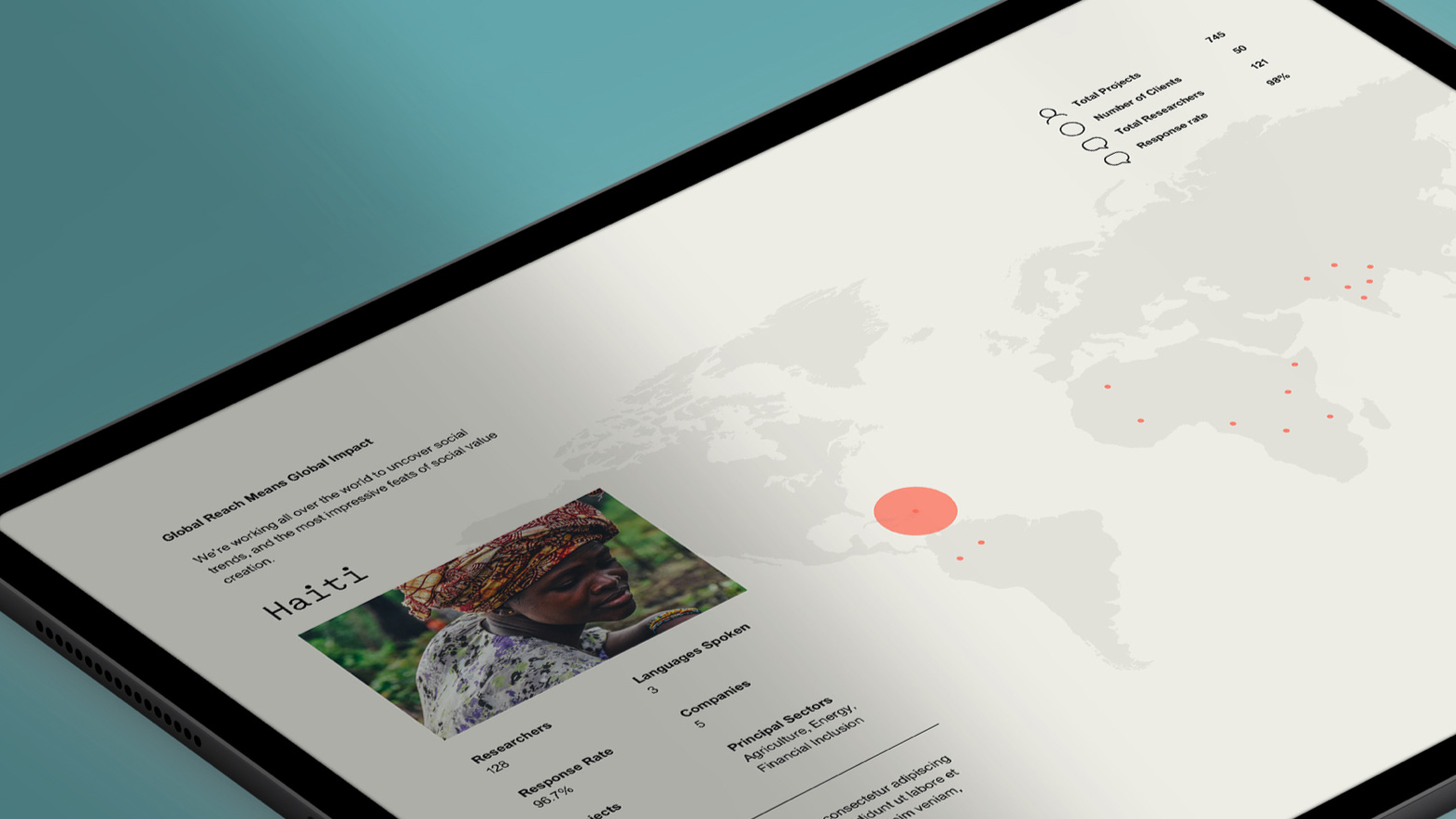 We always focus on designing what makes an organisation special. For 60 Decibels this includes an interactive map showing they have over 750 highly trained researchers around the world.